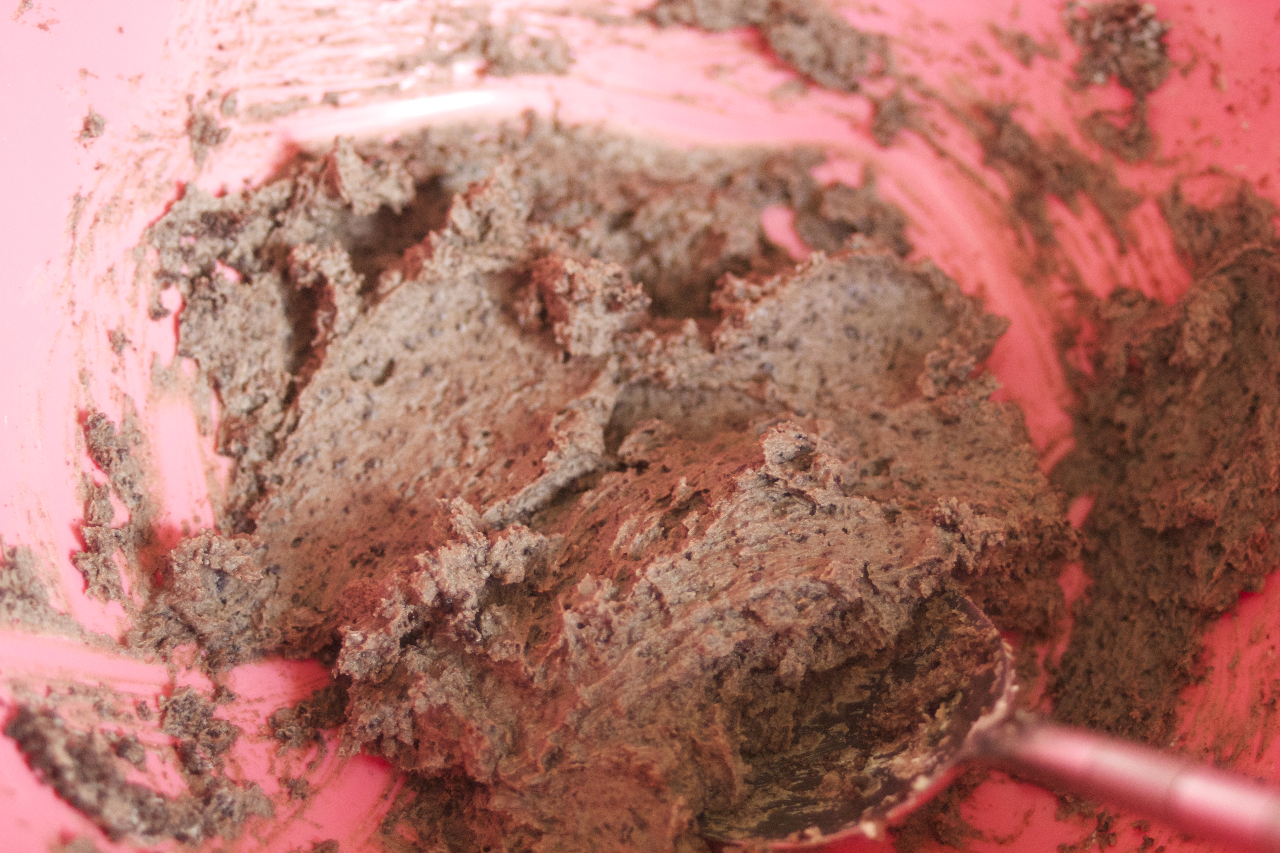 - Tip about a quarter of the cream cheese into a bowl and add the Oreo ‘dust’. Mix them together with a fork until well blended – together they make a brownish paste.
