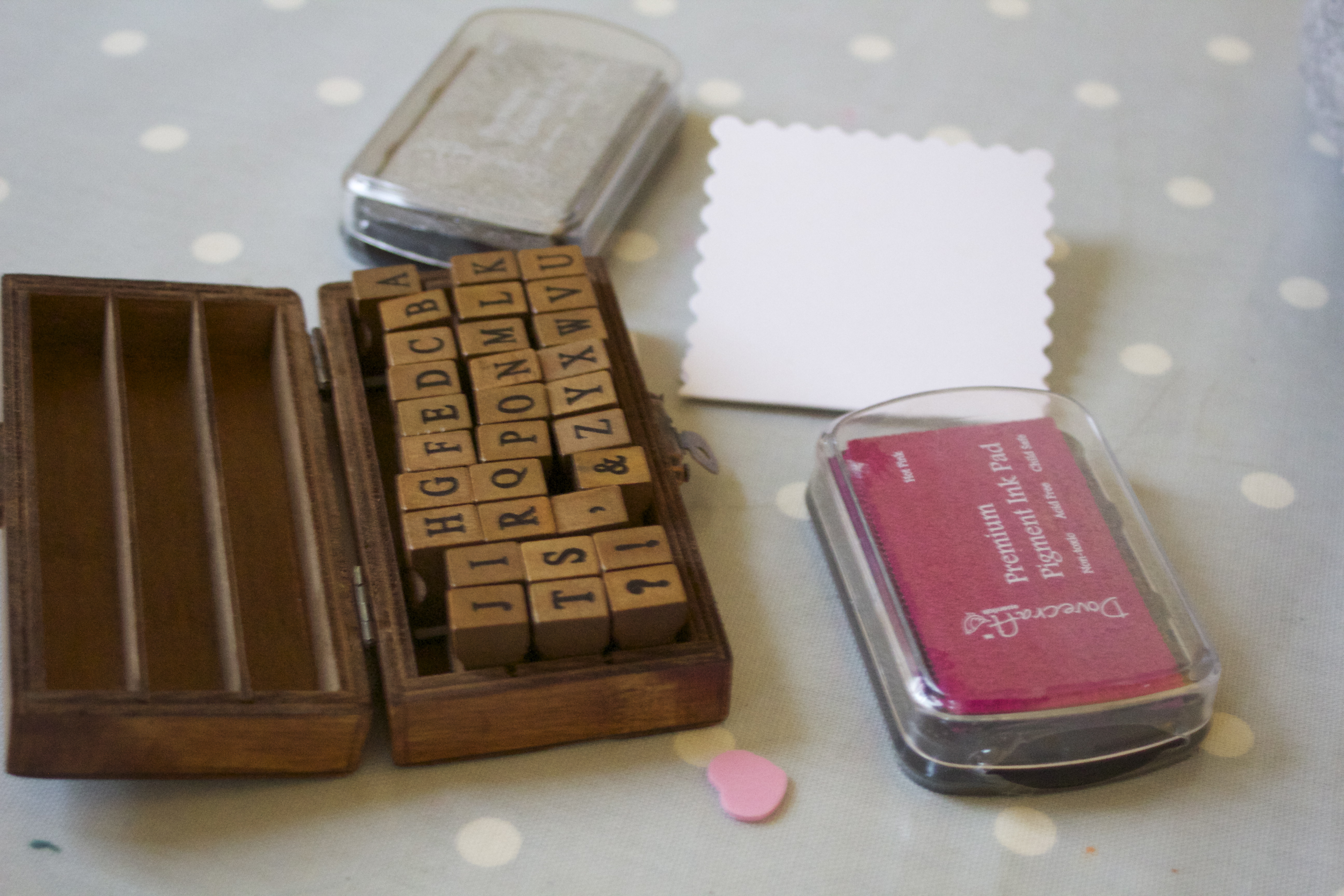Mook made a “I *heart* U” Card using alphabet stamps, ink pads, a pre-cut card and a foam heart.