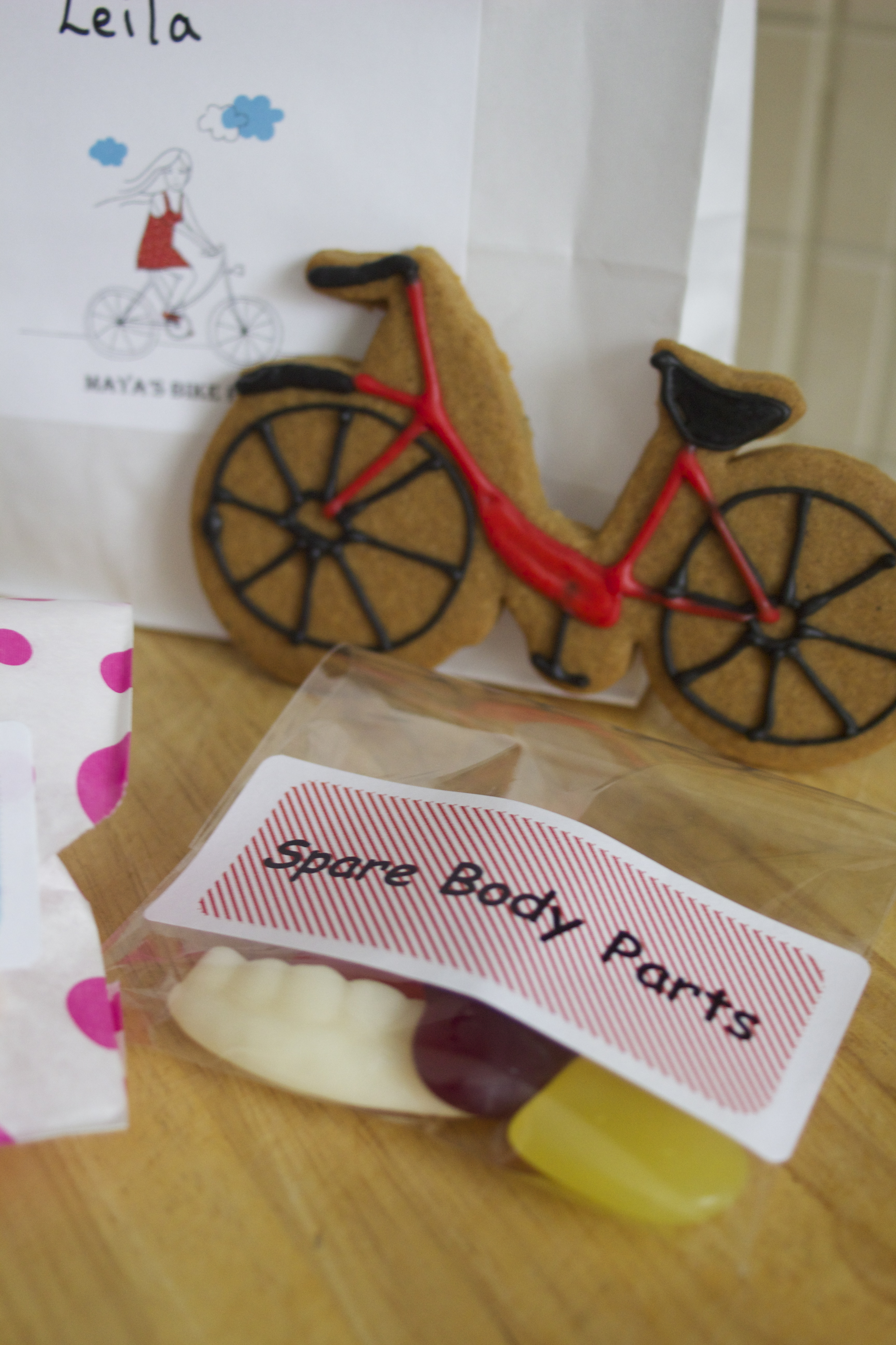 Each party guest also had a bicycle-shaped cookie – this was the second batch of cookies, after I had a cookie disaster when I accidentally baked the first batch, after icing them!